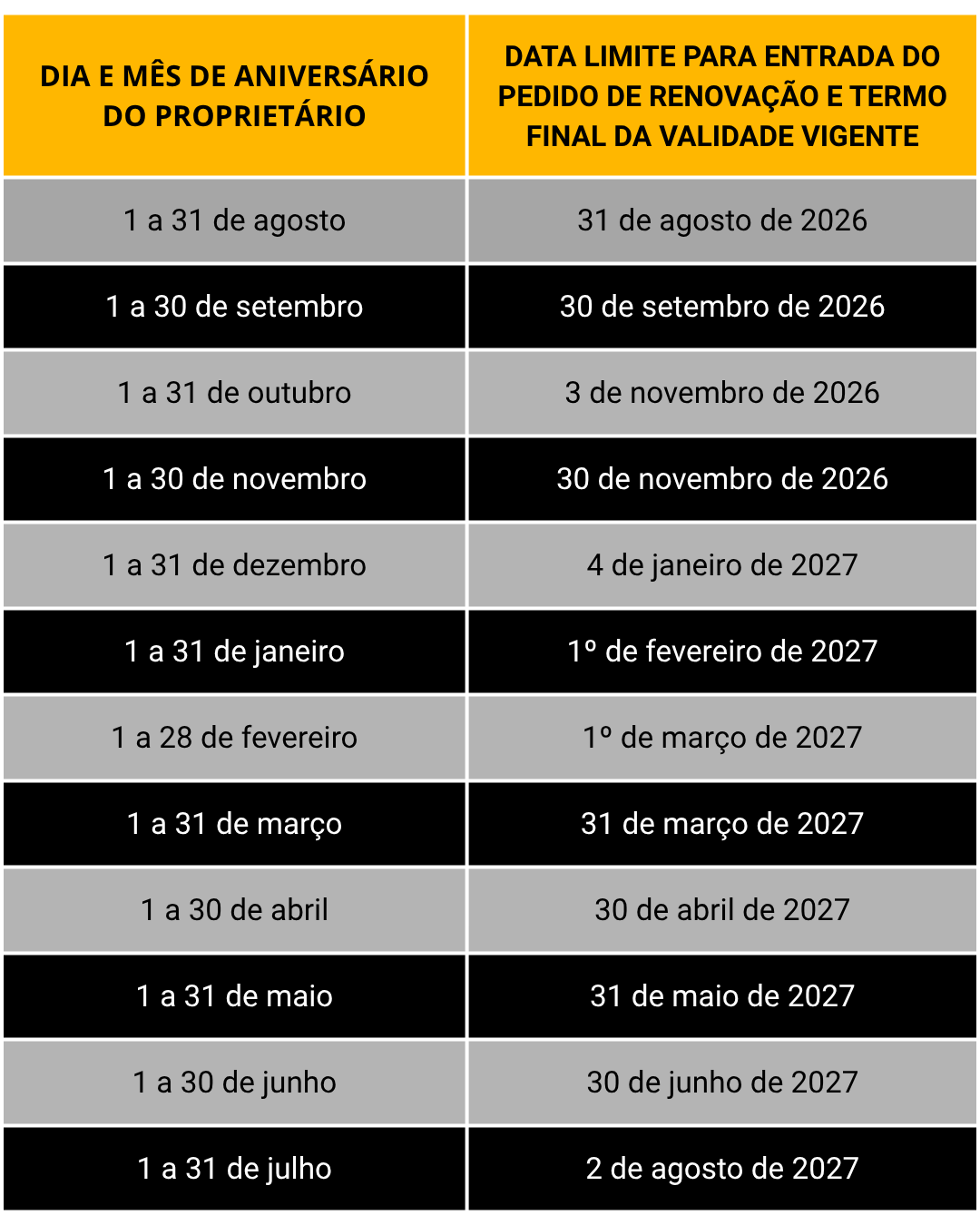 A primeira coluna corresponde ao mês de nascimento do dono da arma, e a segunda indica a nova data de vencimento do CRAF, ou seja, a data limite para protocolar o processo.